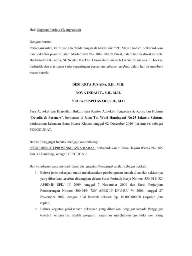 Surat kuasa pada dasarnya merupakan surat keterangan dari seorang pemilik kuasa yang memberikan kuasa yang ia miliki pada orang lain. Penyelesaian sengketa wanprestasi atas kredit macet dalam. Doc surat gugatan wanprestasi brenda isabella academia edu. Contoh gugatan badan hukum perdata · contoh surat kuasa khusus · contoh surat kuasa insidentil dan surat permohonan izin insidentil menyatakan para tergugat telah melakukan wanprestasi. Contoh format pembuatan surat kuasa khusus.