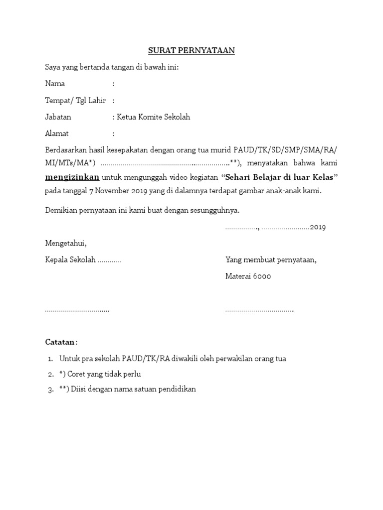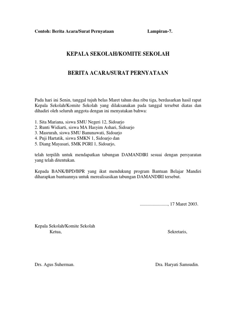 Surat pernyataan ini juga dapat dibuat oleh segolongan kelompok yang mana untuk mencapai suatu kesepakatan dengan kelompok lainnya. Misalnya, surat pernyataan yang berisi tentang pernyataan siswa untuk tidak mengulangi perbuatan buruknya di sekolah atau. Sk penetapan komite sekolah oleh kepala seakolah berdasarkan hasil musyawarah dengan masyarakat dengan melampirkan daftar hadir musyawarah. Adapun mengenai pengertian dari surat pernyataan adalah sebuah surat yang dibuat oleh seseorang dimana di dalam surat tersebut berisi sebuah pernyataan yang. Adapun contohnya adalah surat pernyataan pindah sekolah dari orang tua siswa dengan alasan tertentu.
