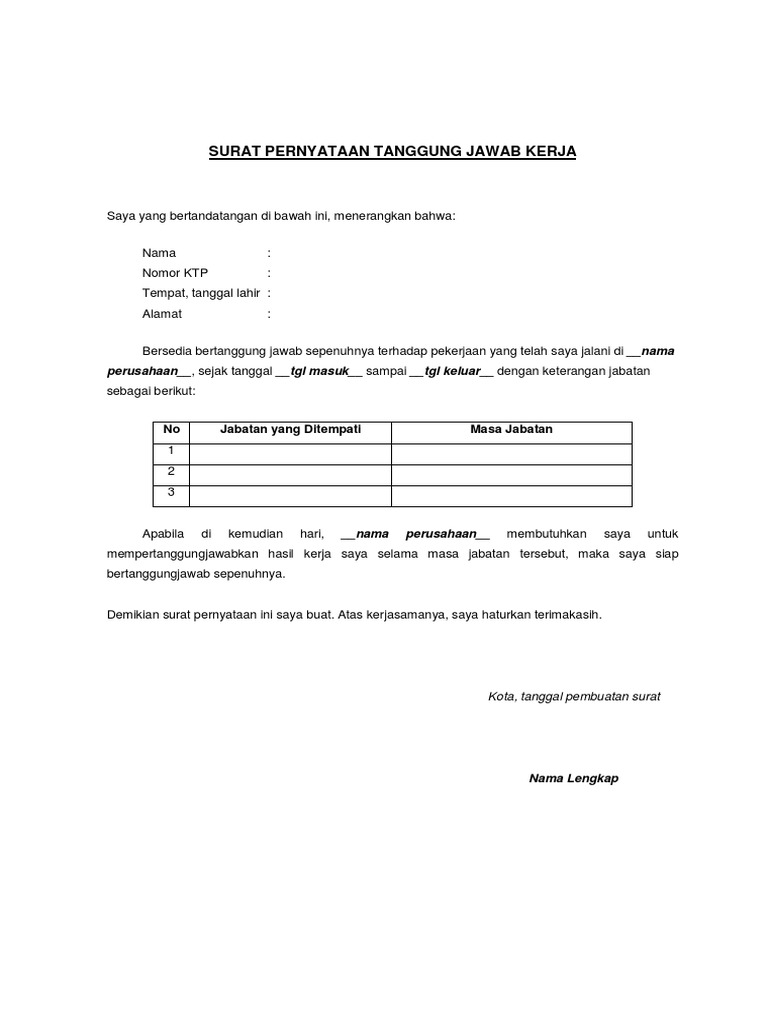 Surat pernyataan perjanjian pertanggungjawaban secara umum merupakan sebuah surat yang berisikan pelimpahan tanggung jawab dalam bentuk apapun yang bisa anda sesuaikan sendiri dengan berbagai keperluan anda. Kami yang bertandatangan di bawah ini surat pertanggungjawaban biasanya dibuat untuk menyatakan tanggung jawab pimpinan terhadap sesuatu yang berlangsung pada instansi yang dipimpinnya. Bangunan baru (pelaksana) surat pernyataan pertanggungjawaban perencanaan konstruksi yang bertanda tangan di bawah ini. Surat pernyataan adalah surat yang dibuat untuk menyatakan bahwa seseorang telah atau tidak pernah melakukan suatu hal. Ketika dua orang atau 2 instansi melakukan kesepakatan, biasanya akan diperlukan sebuah perjanjian.