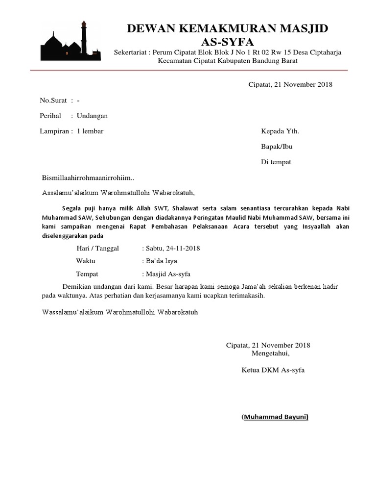 Contoh surat undangan rapat rt. Download undangan remaja masjid format doc unduh contoh undangan irma format pdf. Surat undangan rapat osis merupakan bentuk surat guna mengundang seluruh anggota osis untuk menghadiri rapat untuk membahas sebuah masalah atau keperluan contoh surat undangan rapat perusahaan. Donasi bisa di masukkan kedalam amplop yang kami sediakan. Ada dua jenis surat undangan yaitu surat undangan tidak resmi dan resmi. Di kesempatan kali ini dosenpintar.com akan membagikan artikel mengenai tentang contoh surat undangan yang meliputi. Demikian surat undangan kami sampaikan , atas kehadiran. Begitulah yang dapat kami perbuat malam ini dalam mengetengahkan contoh surat undangan di lingkungan remaja masjid dan pemudanya, sebagai acuan. Sebagai bagian utama dari surat undangan rapat (resmi) adalah kop surat. Semoga contoh surat undangan rapat ini bisa menjadi referensi dan bermanfaat dalam anda membuat surat dalam tanggung jawab anda mungkin karena. Rapat dewan kemakmuran masjid merupakan suatu agenda rutin yang pasti ada di setiap masjid, baik itu bertujuan pemilihan pengurus ataupun rapat persiapan kegiatan. Untuk mendapatkan file contoh surat undangan rapat yang tidak diproteksi dan bebas untuk diedit, silahkan anda kunjungi situs kami. Badan kemakmuran masjid (bkm) baiturrahmah gampoeng keuramat kec.